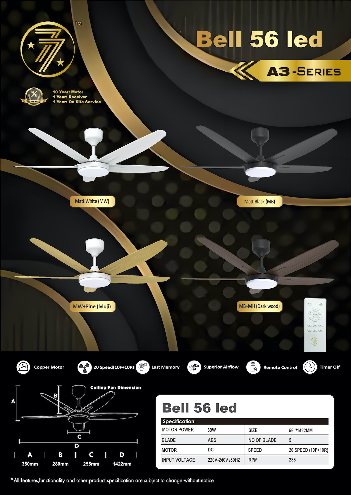 The Bell 56 LED DC Fan blends powerful performance with elegant illumination. Featuring 5 blades and a 56-inch span, it offers 12 speeds (6 forward + 6 reverse) for optimal airflow. Equipped with a 36W 3-color LED light and remote control, the Bell 56 LED provides comfort, efficiency, and style in one sleek design.