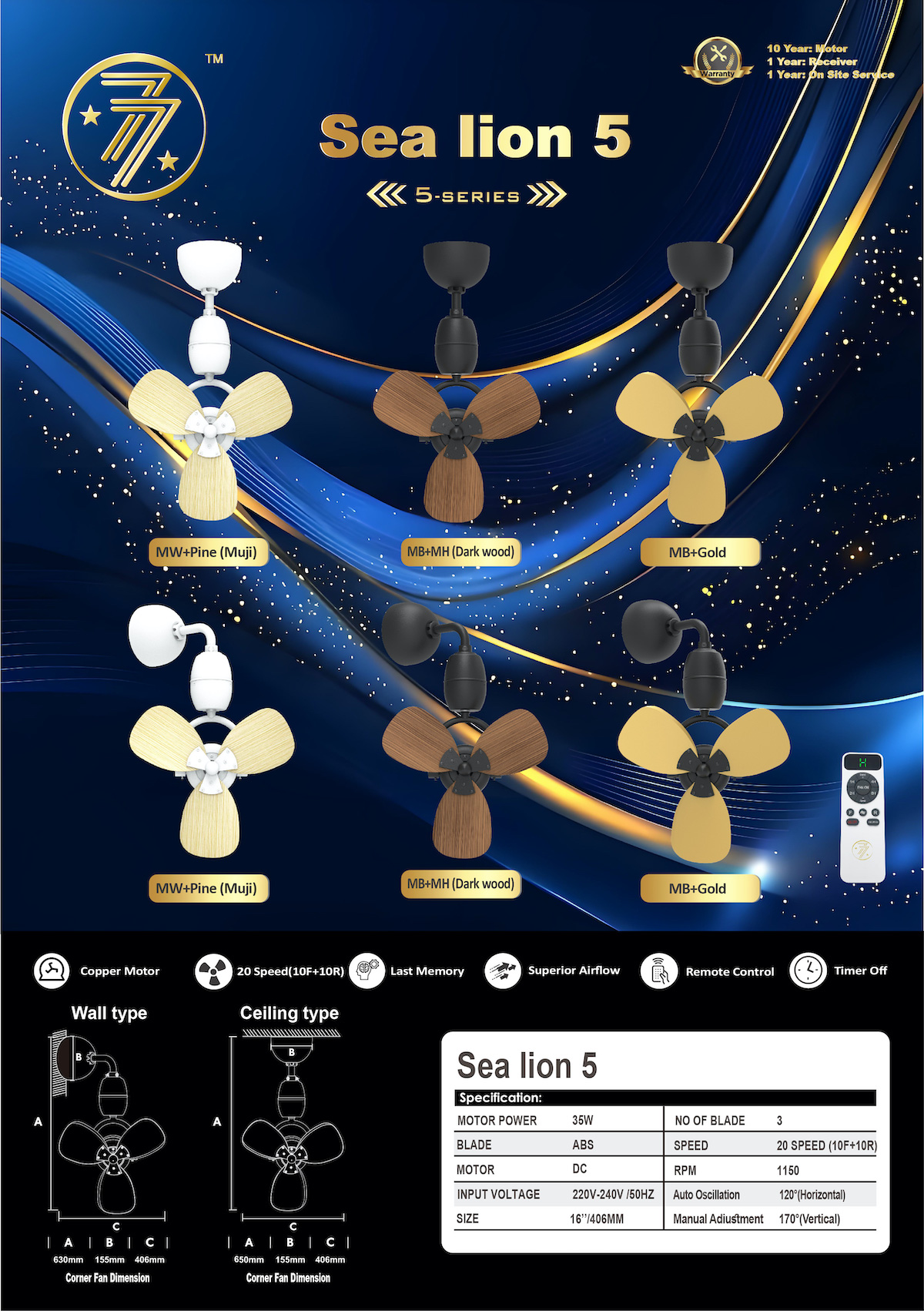 The Sea Lion 5 DC Fan delivers elegant design and superior comfort. Equipped with 3 blades and a 16-inch size, it features 20 speeds (10 forward + 10 reverse) for precise airflow control. Effortlessly operated via LED remote, it’s the perfect blend of style and performance for any modern interior.